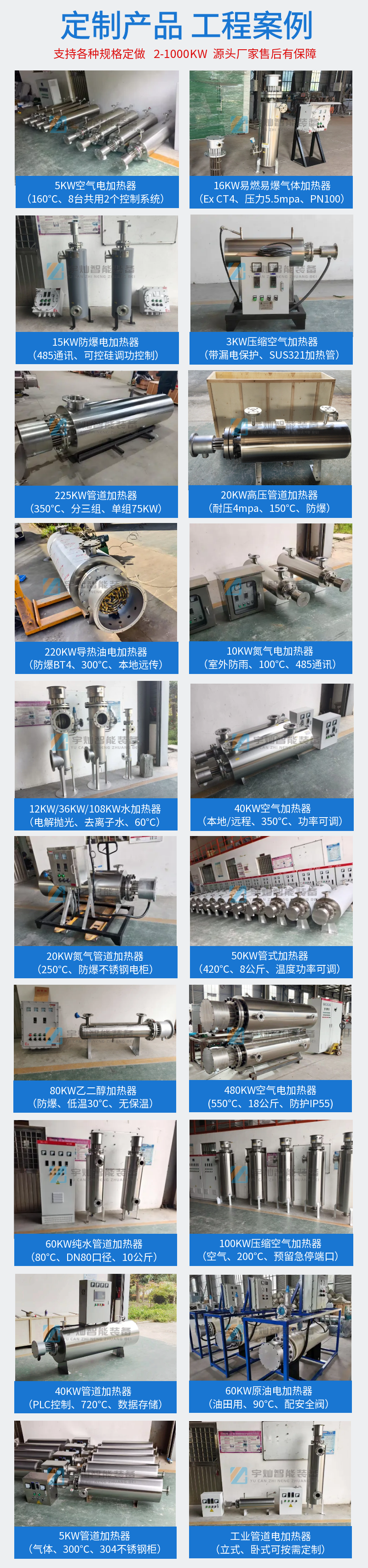 1、气体管道式加热器通常用来加热空气、氮气等气体,能在很短的时间内将气体加热到所需的温度。